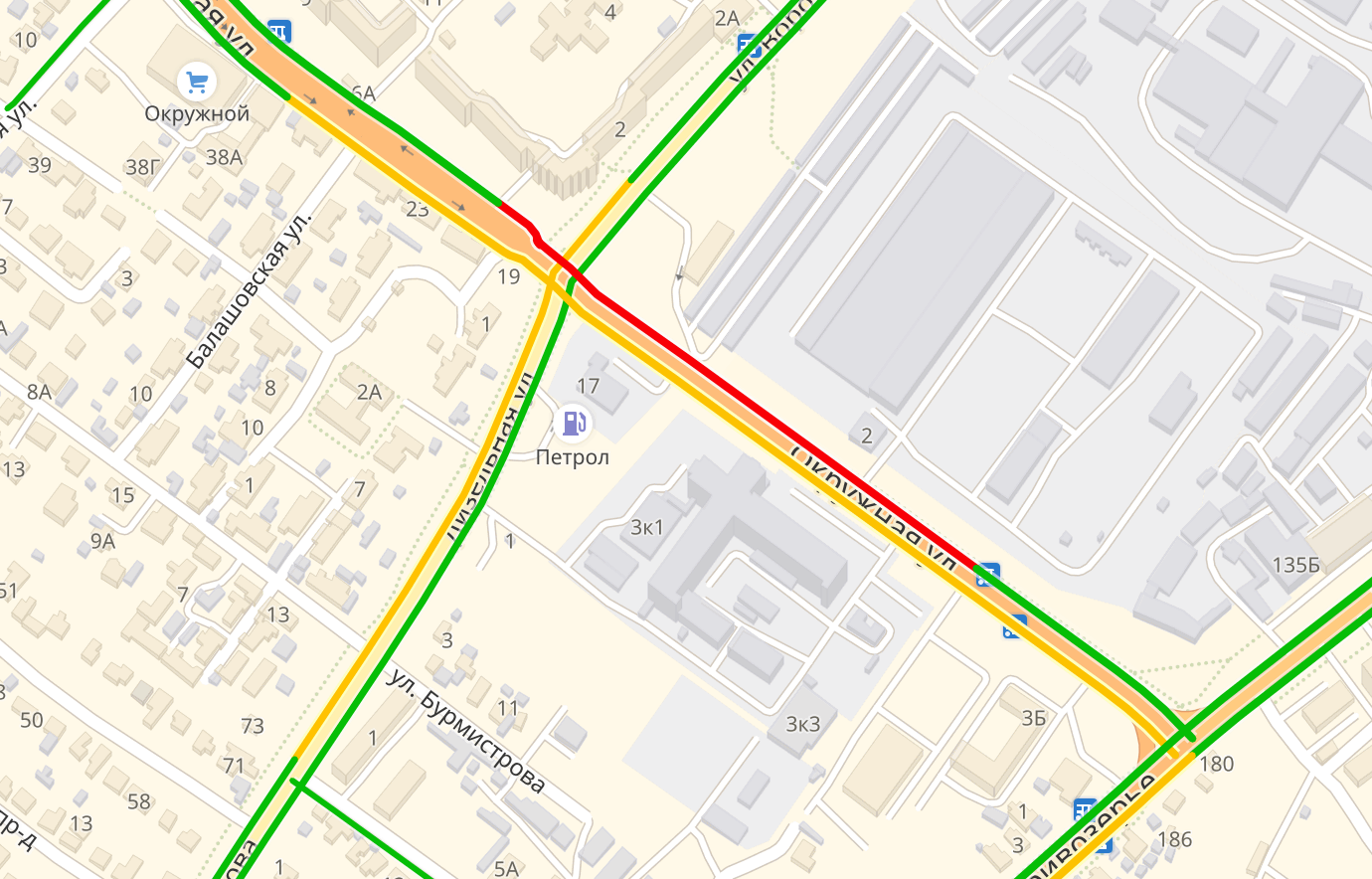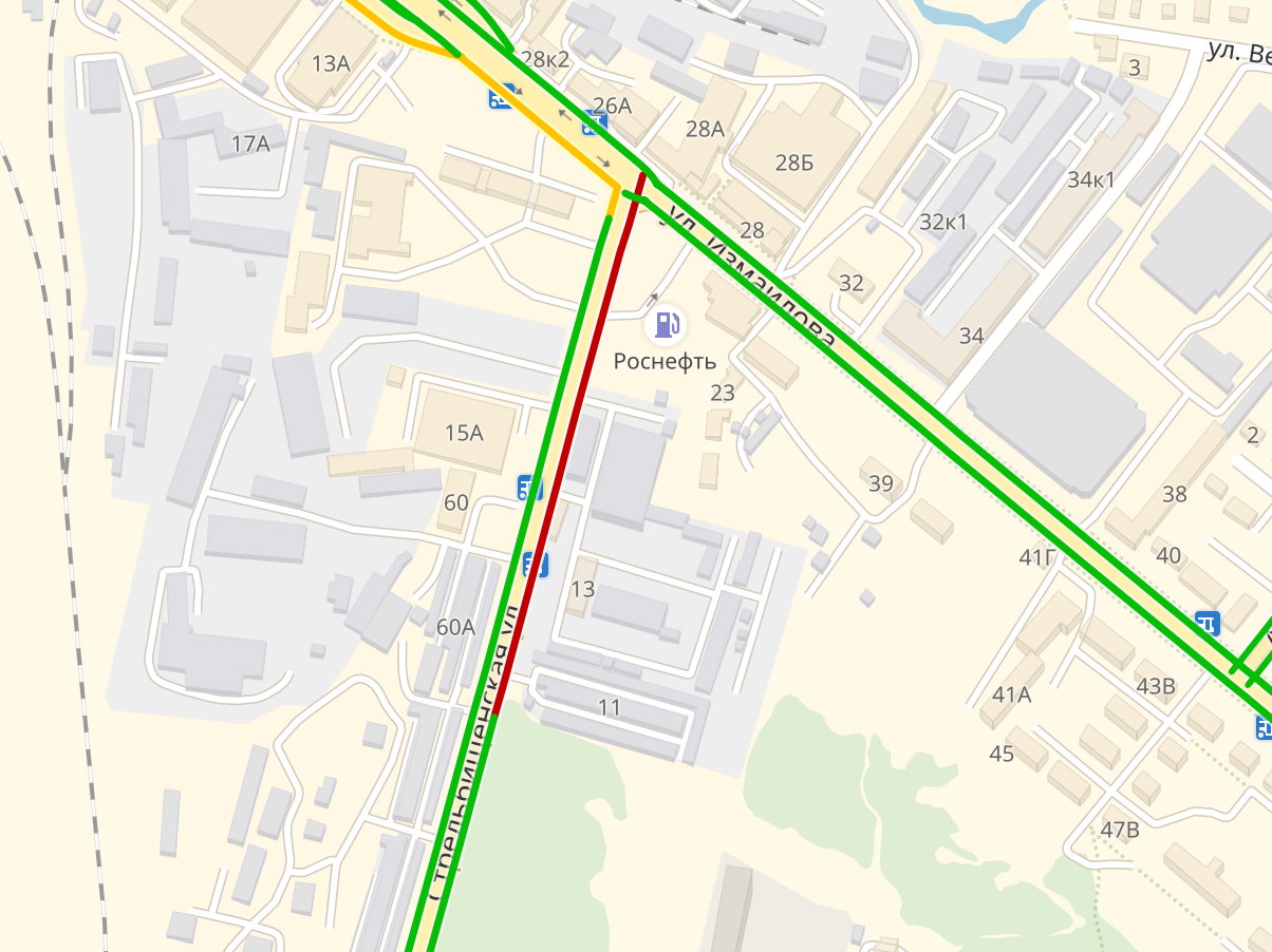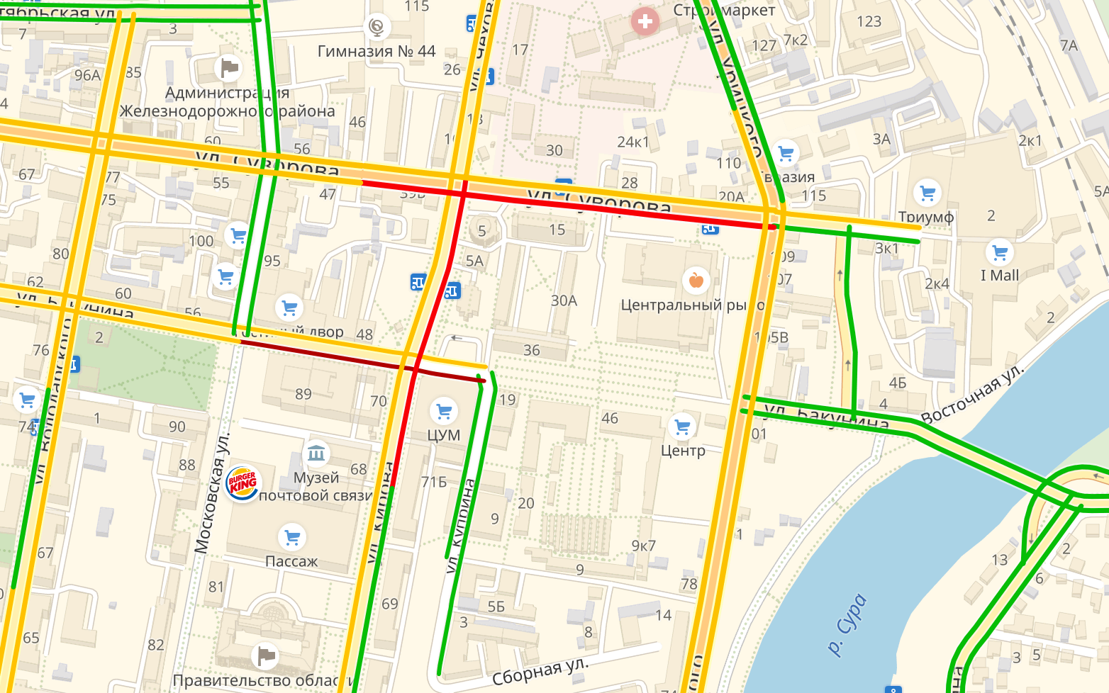 По данным сервиса Яндекс.Карты, снижена скорость автомобилей на улицах Суворова, Кирова и Бакунина.