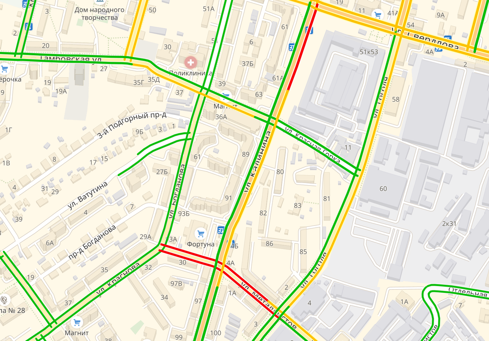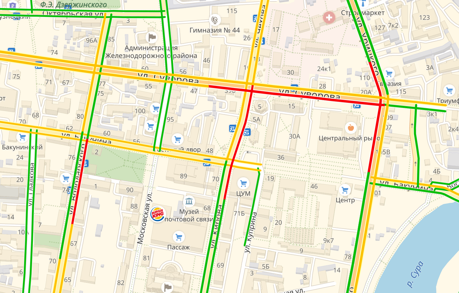По данным сервиса Яндекс.Карты, снижена скорость автомобилей на улицах Урицкого, Суворова, Кирова и Володарского.