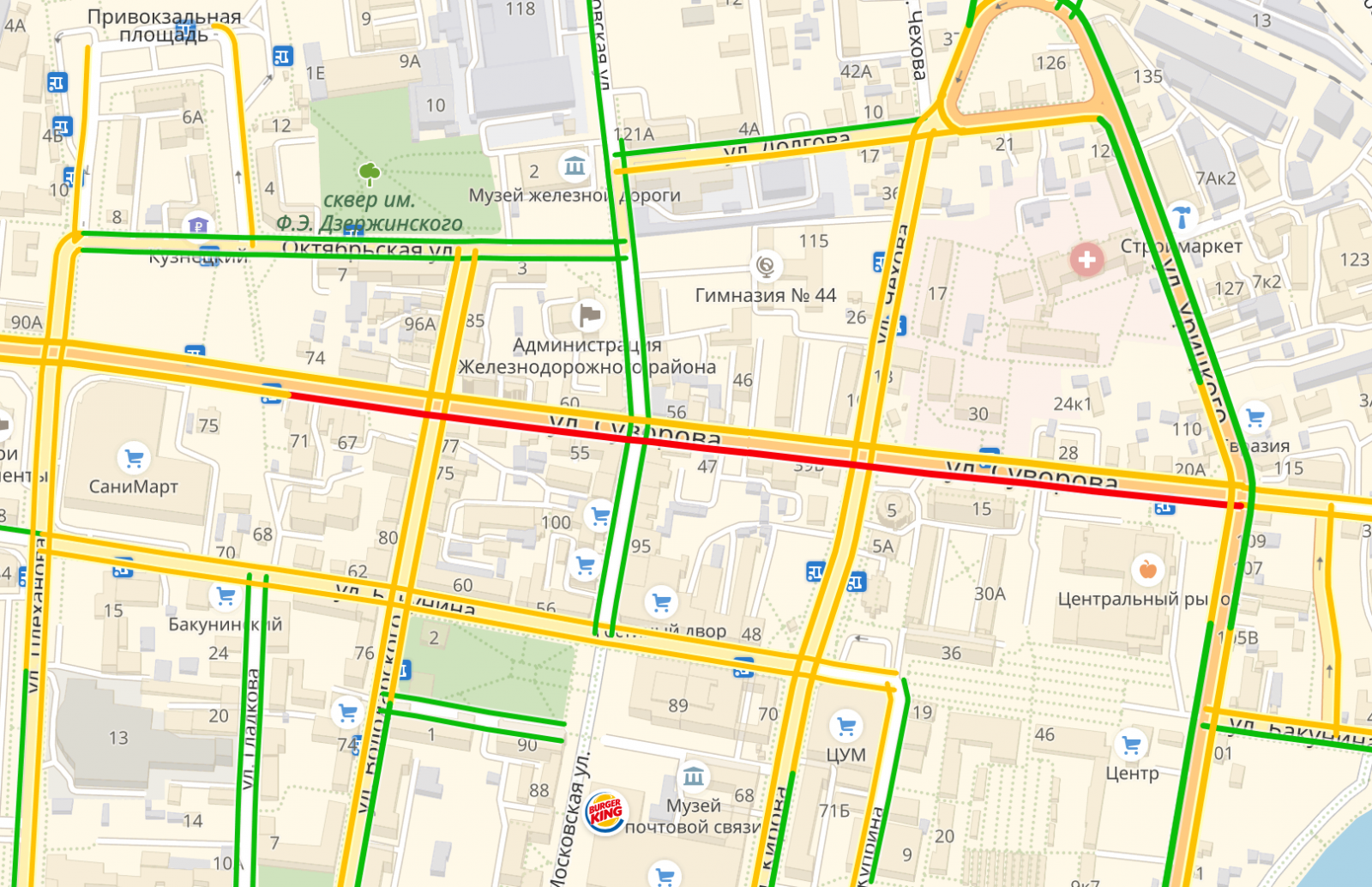 По данным сервиса Яндекс.Карты, снижена скорость автомобилей на улице Суворова.