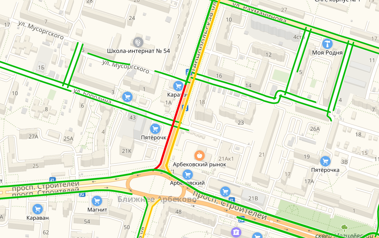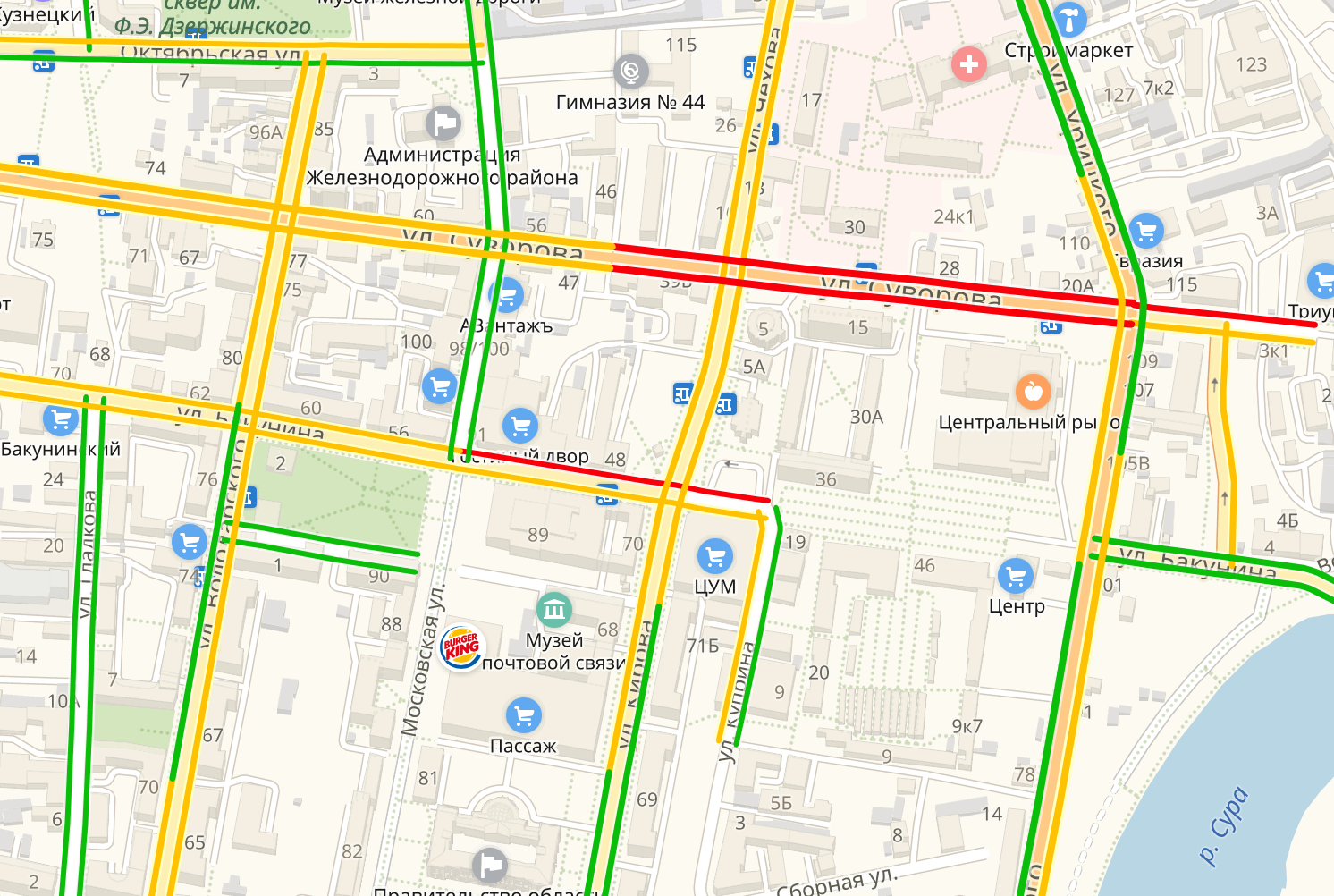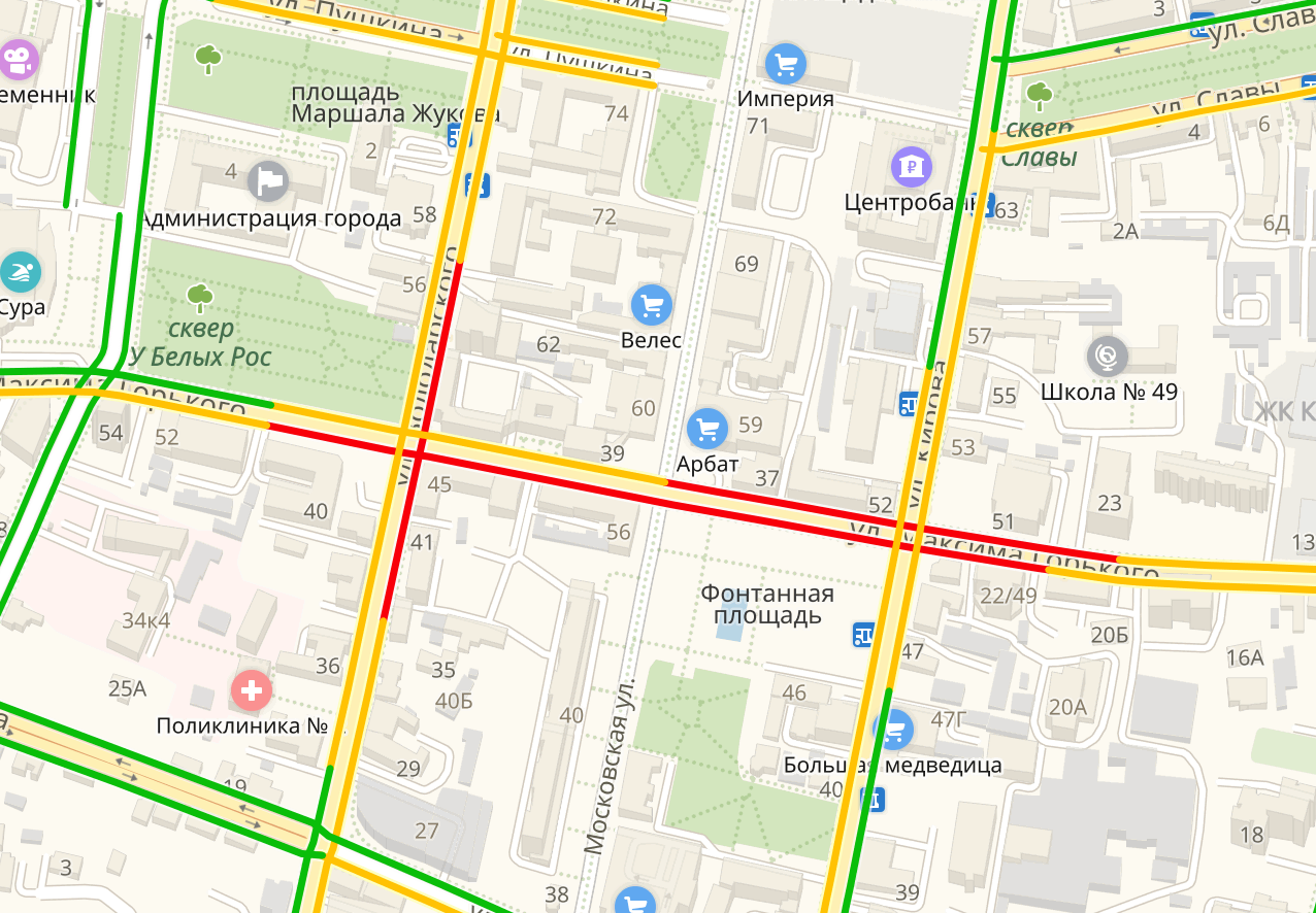 По данным сервиса Яндекс.Карты, снижена скорость автомобилей на улицах Суворова и Бакунина.