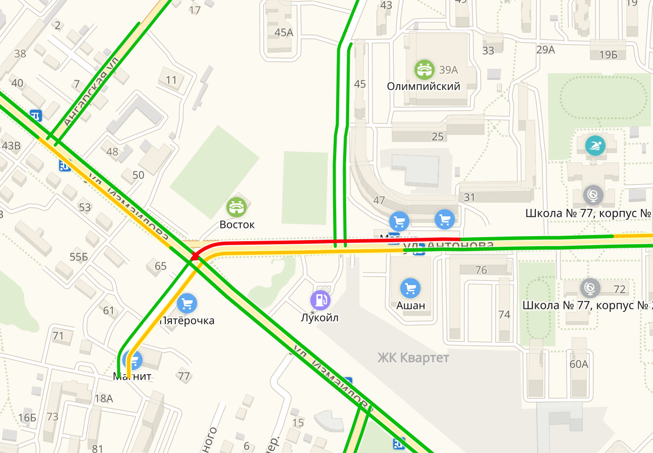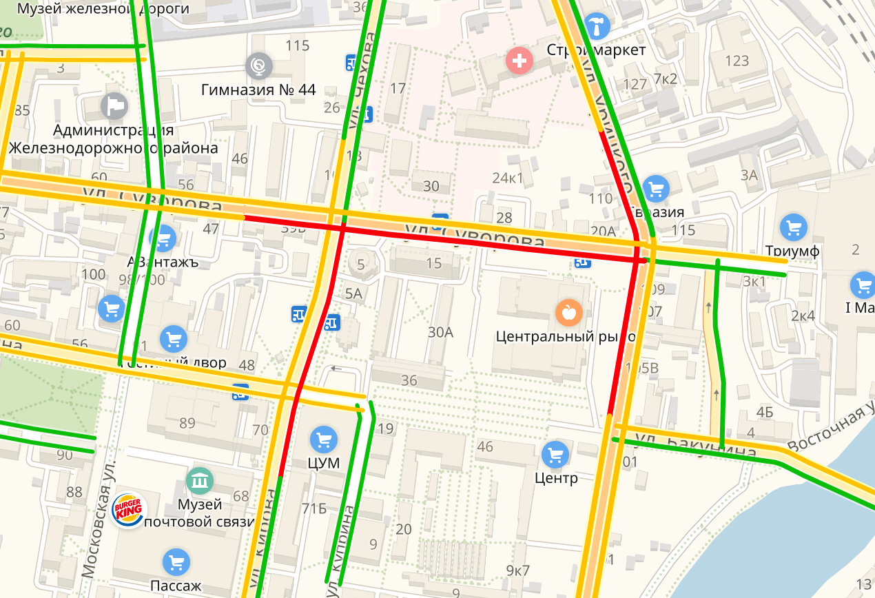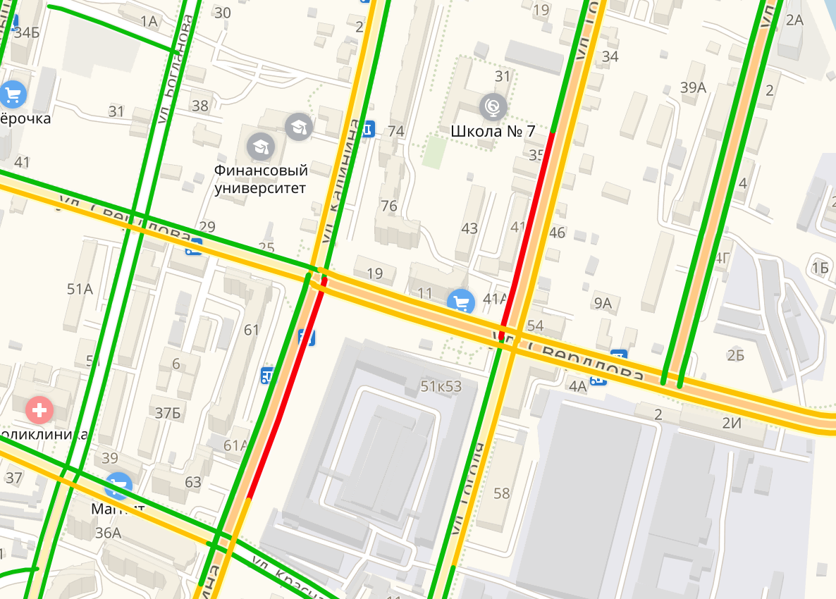 По данным сервиса Яндекс.Карты, снижена скорость автомобилей на улицах Урицкого, Суворова и Кирова.