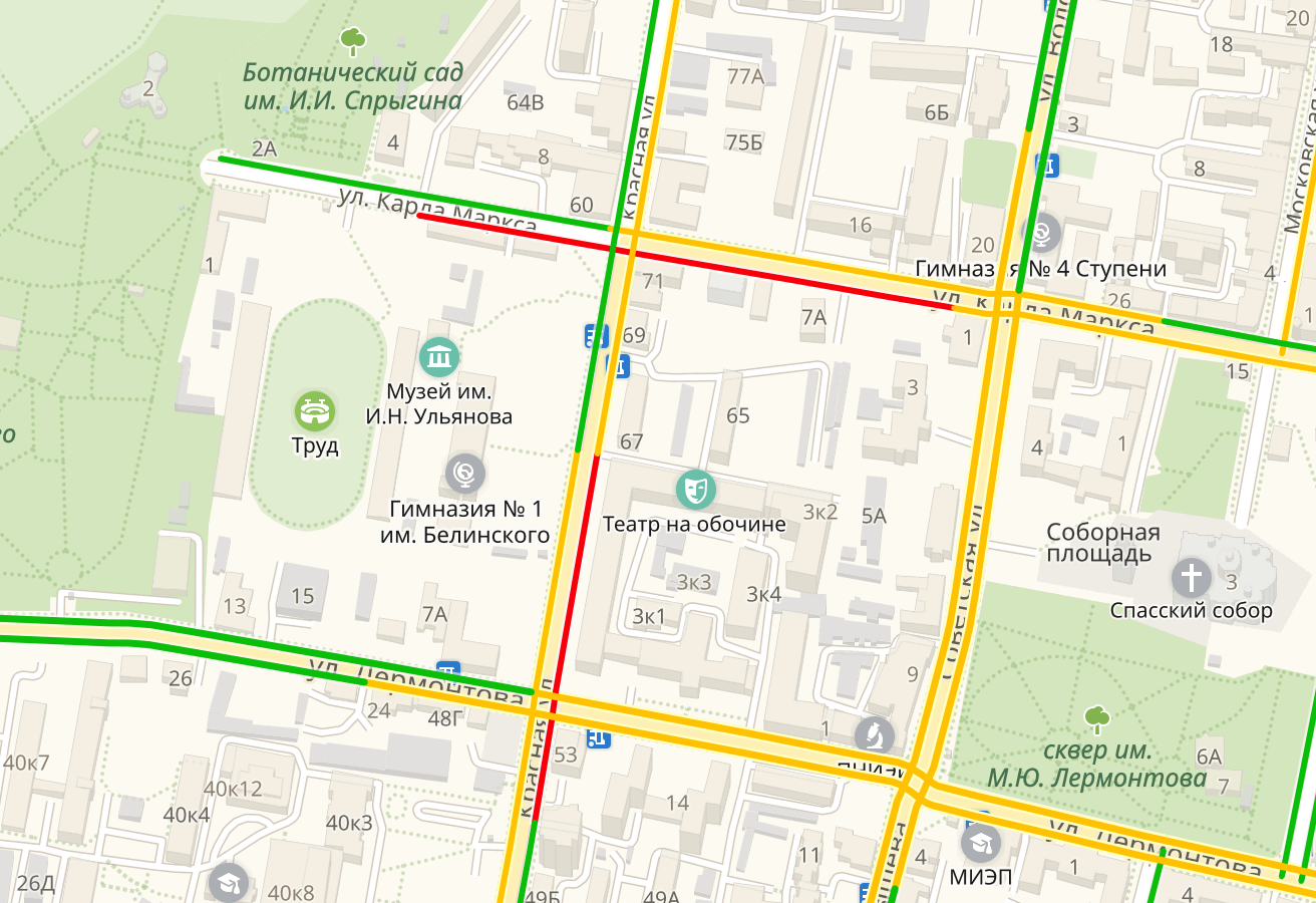 По данным сервиса Яндекс.Карты, снижена скорость автомобилей на улицах Суворова, Бакунина и Кирова.