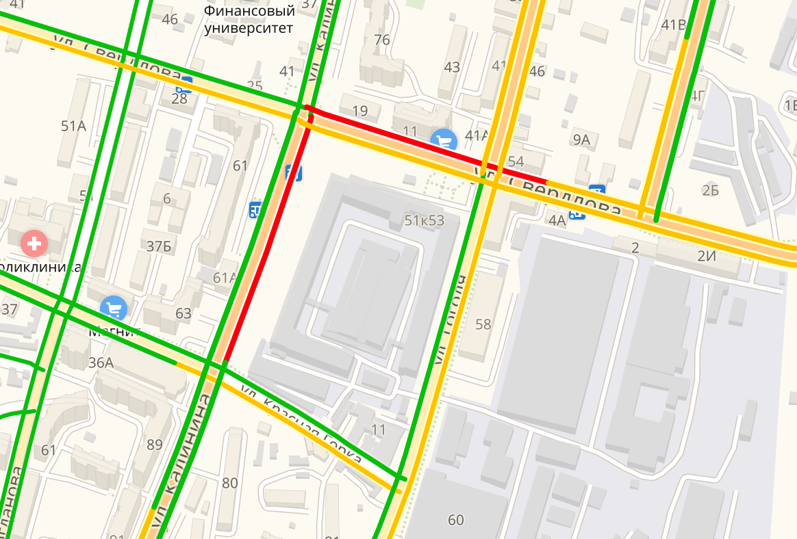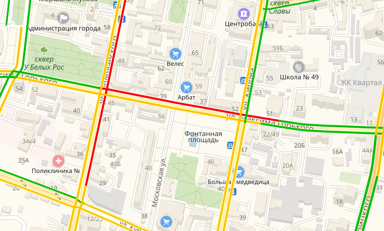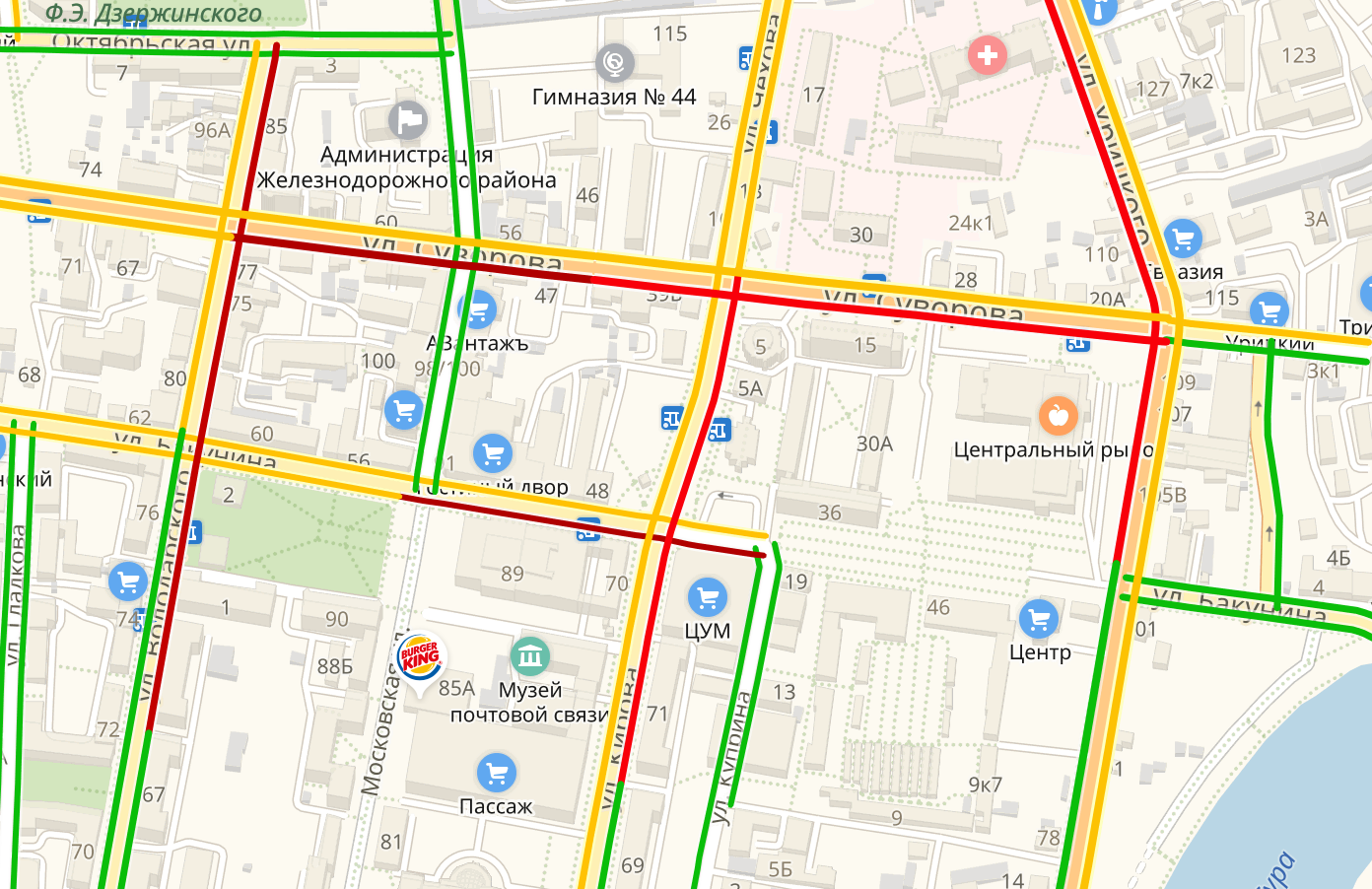 По данным сервиса Яндекс.Карты, снижена скорость автомобилей на улицах Суворова, Володарского, Кирова, Урицкого и Бакунина.