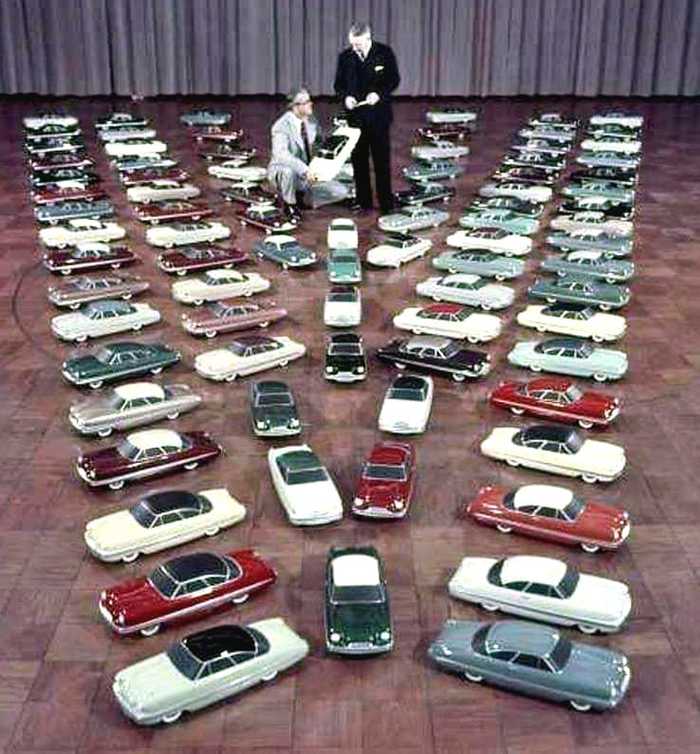 Два работника автомобильного завода выбирают возможные варианты покраски автомобилей