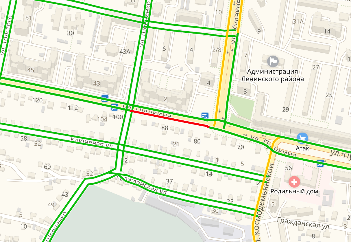По данным сервиса Яндекс.Карты, снижена скорость автомобилей на улицах Суворова, Кирова и Володарского.
