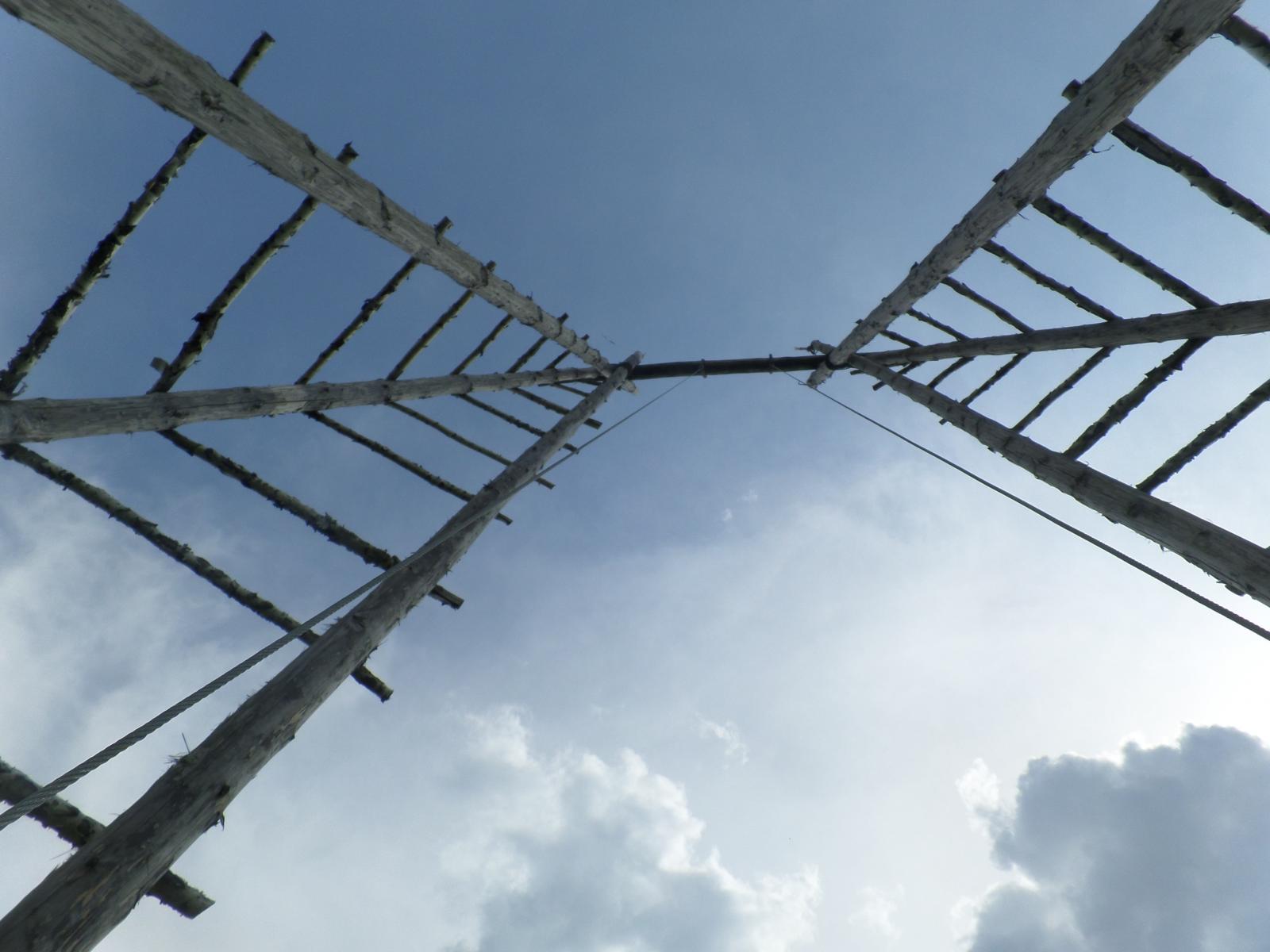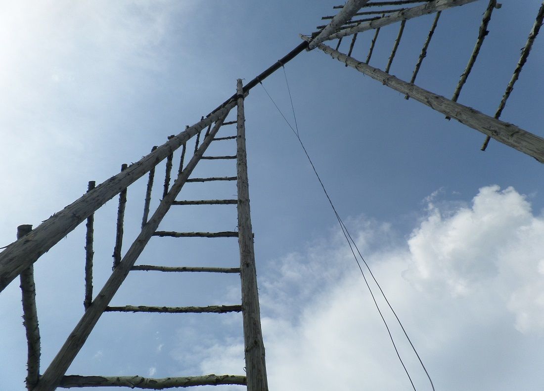Странный объект, который видно с дороги, колол восприятие, как соринка в глазу. Столбы не столбы — конструкция, похожая на деревянную копию современных вышек сотовой связи. Приблизившись, я увидел самый странный аттракцион в своей жизни. И самый экстремальный — гигантские, высотой с пятиэтажный дом качели, которые до жути нелепо выглядели посреди обыденной улицы в нескольких метрах от недавно открытого гиппермаркета.