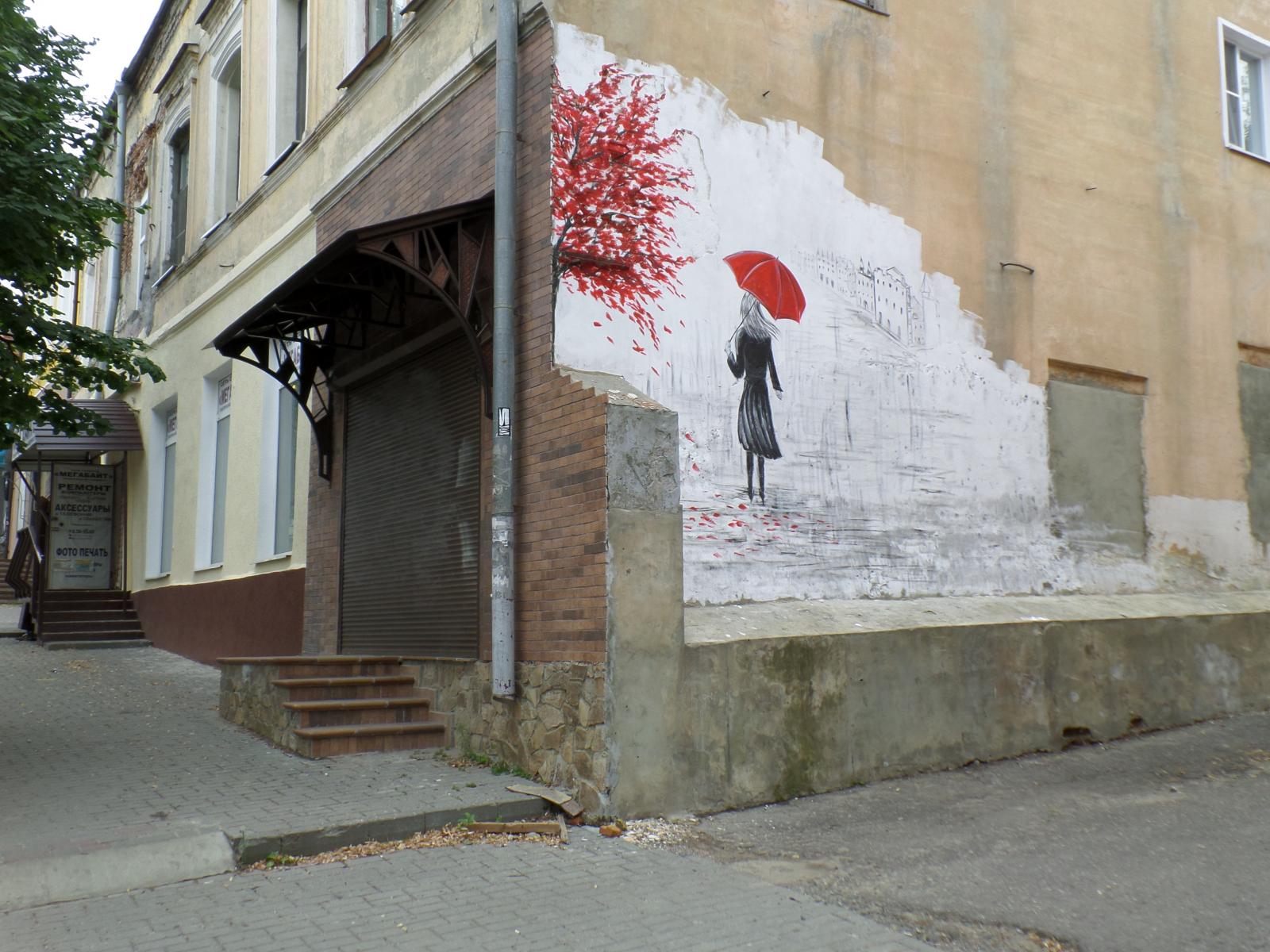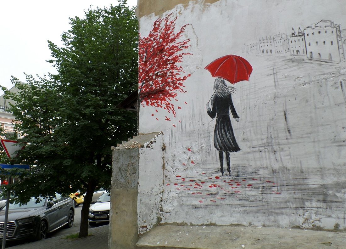 Уличный художник, который его рисовал, видимо еще не набил руку. Слишком по-детски трогательно выглядит женская фигура с красным зонтиком, однако граффити удалось. Ветвь дерева с красными листьями кажется продолжением кроны растущей неподалеку липы. Да и сама девушка какая-то своя, несмотря на то, что незнакомая. Попутчица, одним словом.