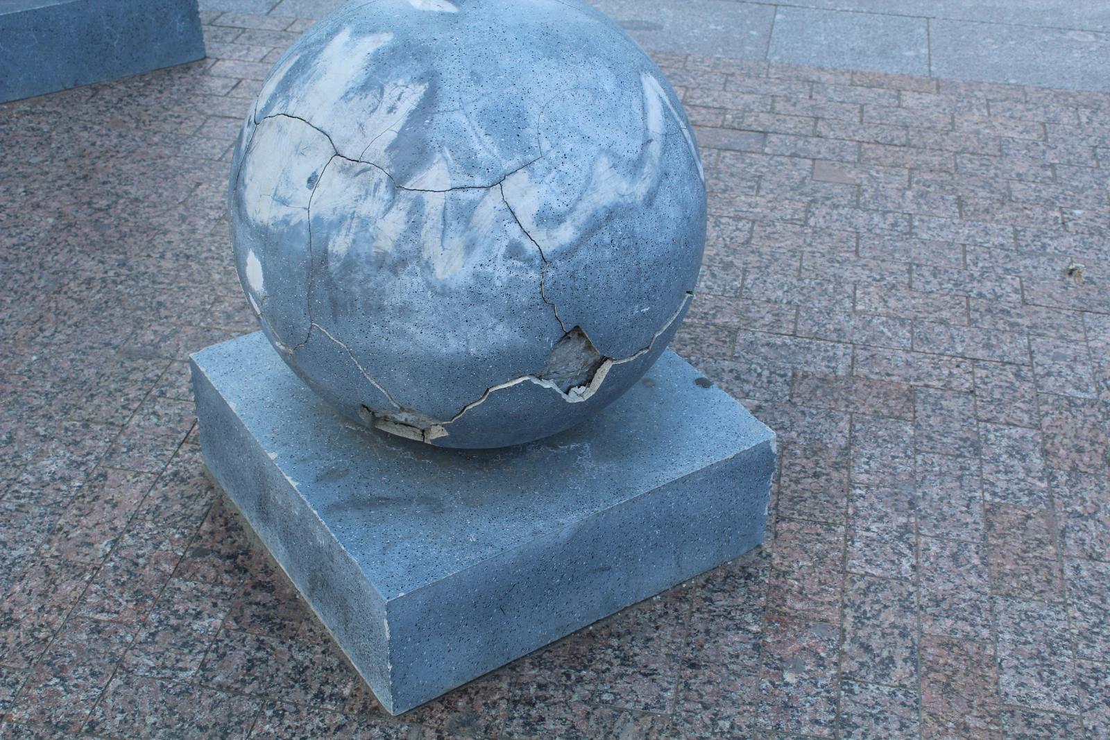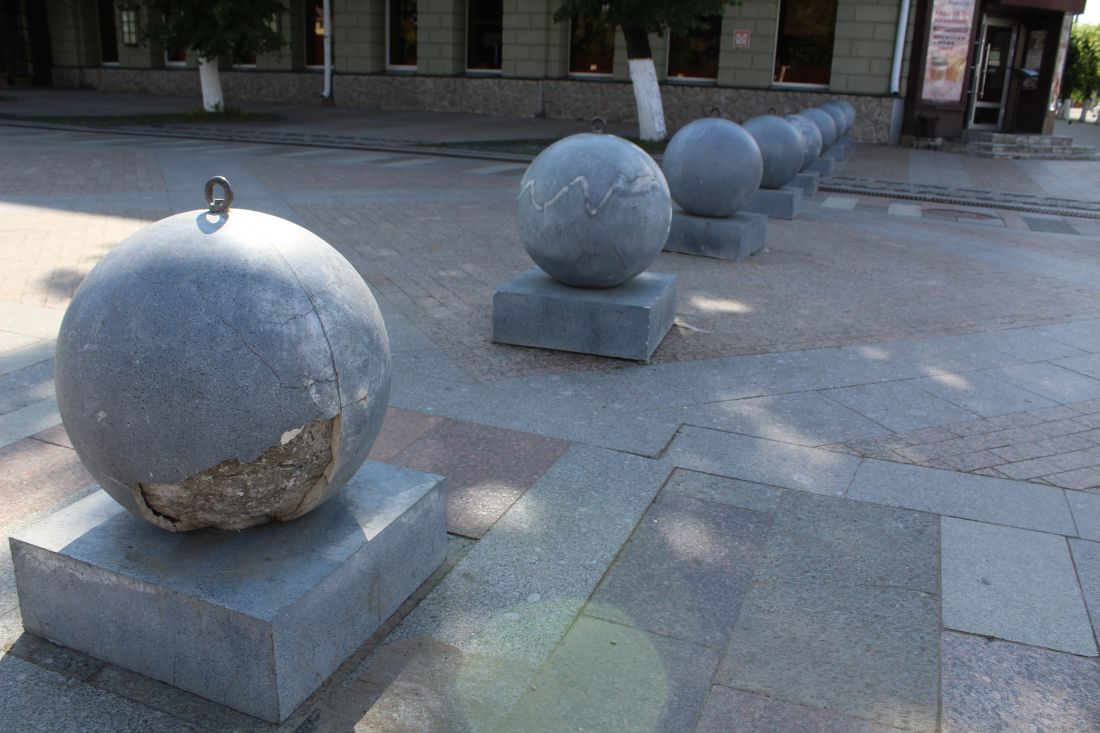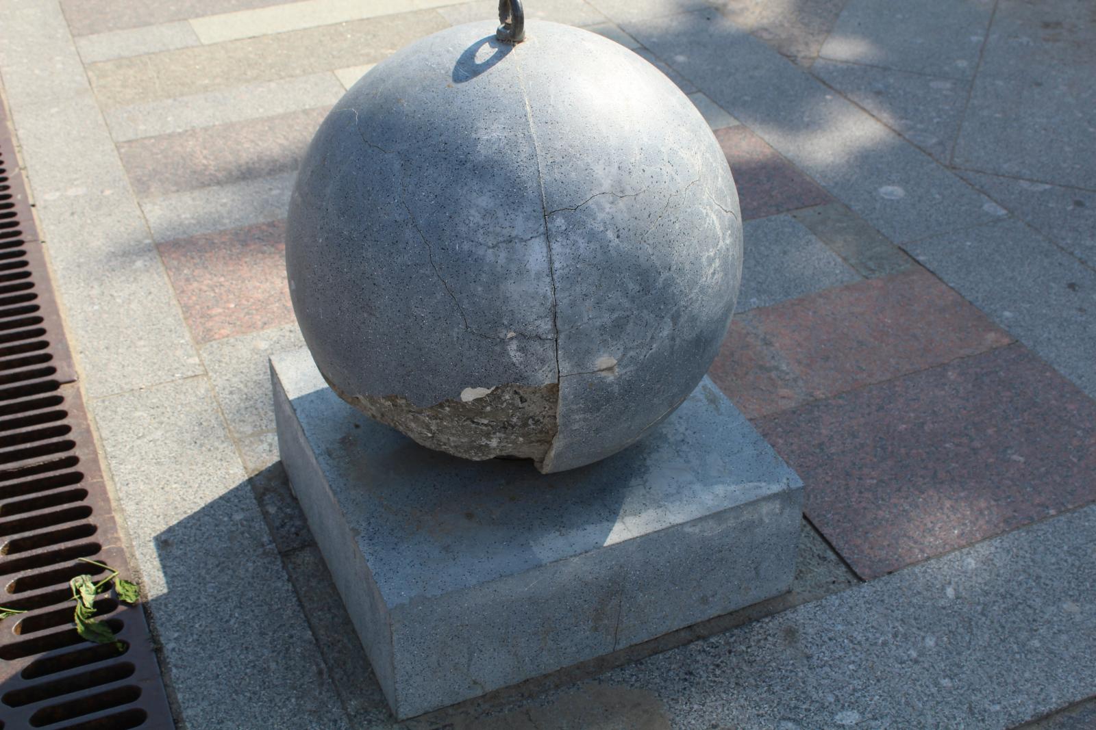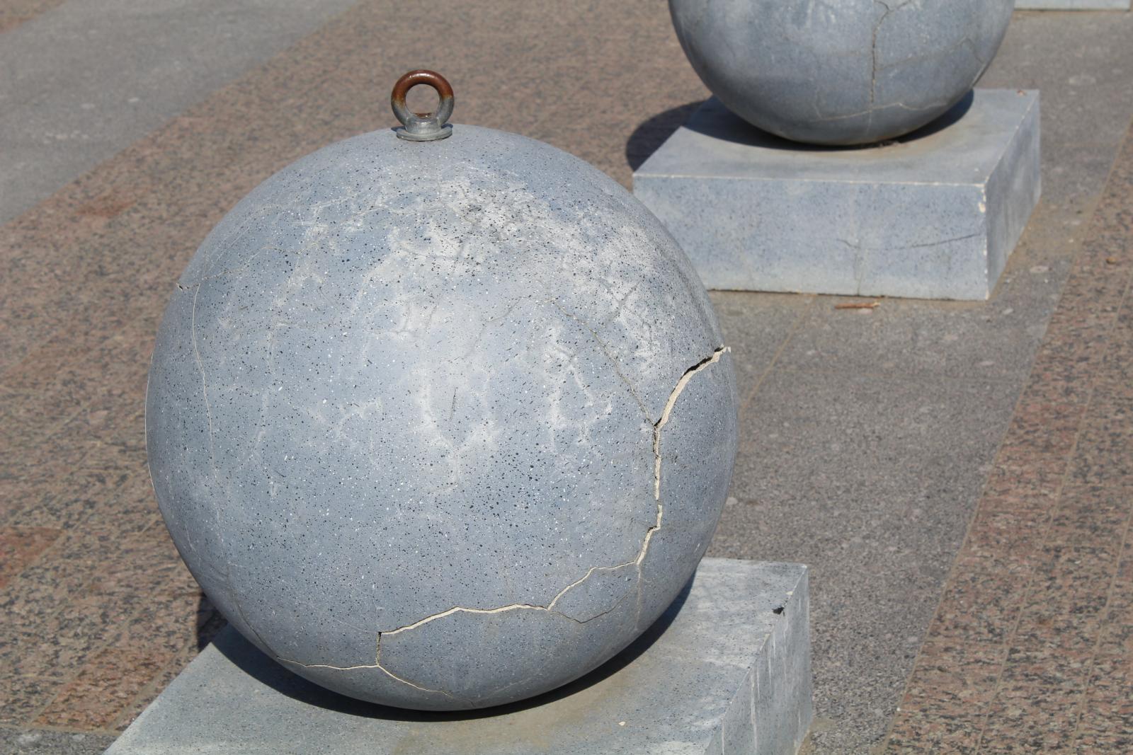 Через два года пришла пора упадка. Бетон не выдержал перепадов температур капризной зимы времен глобального потепления. Череда оттепелей и морозов привела к трещинам. Шары на Московской потрескались по обе стороны пешеходного перехода. Часть из них требует срочного ремонта.