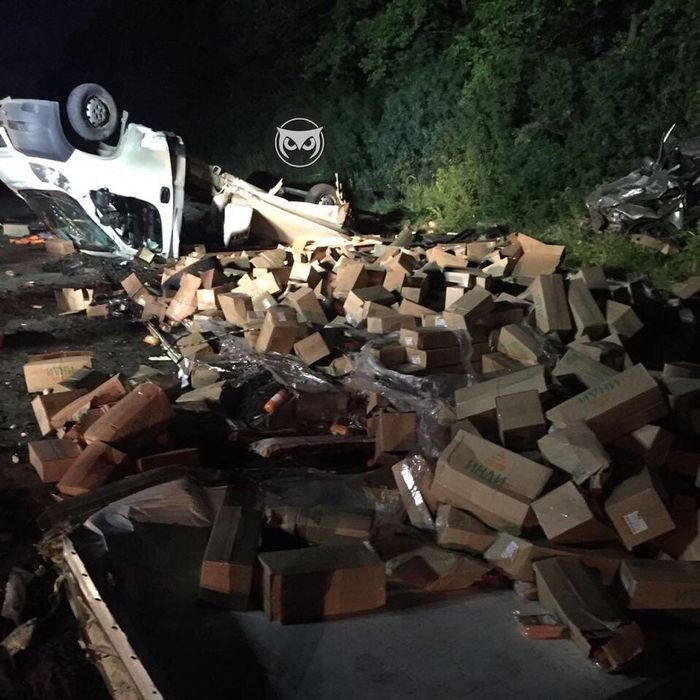 Как сообщают очевидцы, отечественная легковушка врезалась в нагруженную коробками иномарку.