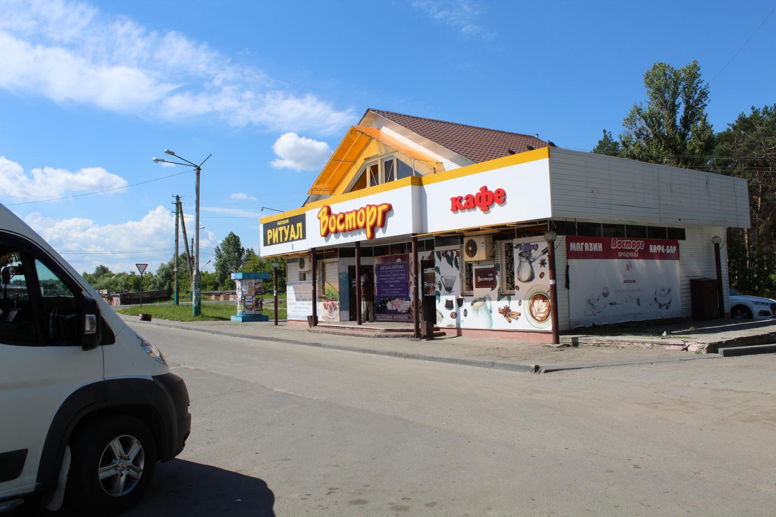 Под одной крышей ютятся небольшая закусочная и погребальная контора. Общее единение олицетворяет надпись «восторг» прямо по центру строения, выросшего из остановочного павильона. Так как фирмы занимают равную площадь, надпись, вероятно, относится к обеим.