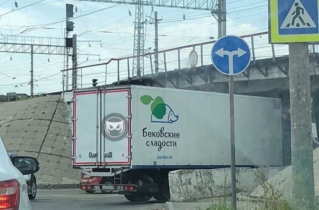 Железнодорожный мост на улице Ерик в Пензе в очередной раз стал непреодолимым препятствием для водителей грузового автотранспорта. Сегодня в двенадцатом часу дня здесь снес ограничительную балку и застрял грузовик, перевозящий кондитерские изделия от известного местного производителя.