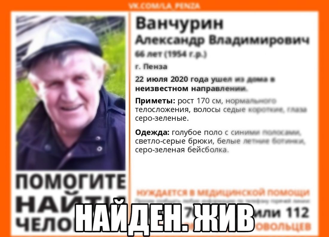 В Телеграм-канале добровольческого поисково-спасательного отряда «Лиза Алерт Пенза» вечером 23 июля появилась информация о том, что 66-летний житель Пензы Александр Ванчурин найден живым.