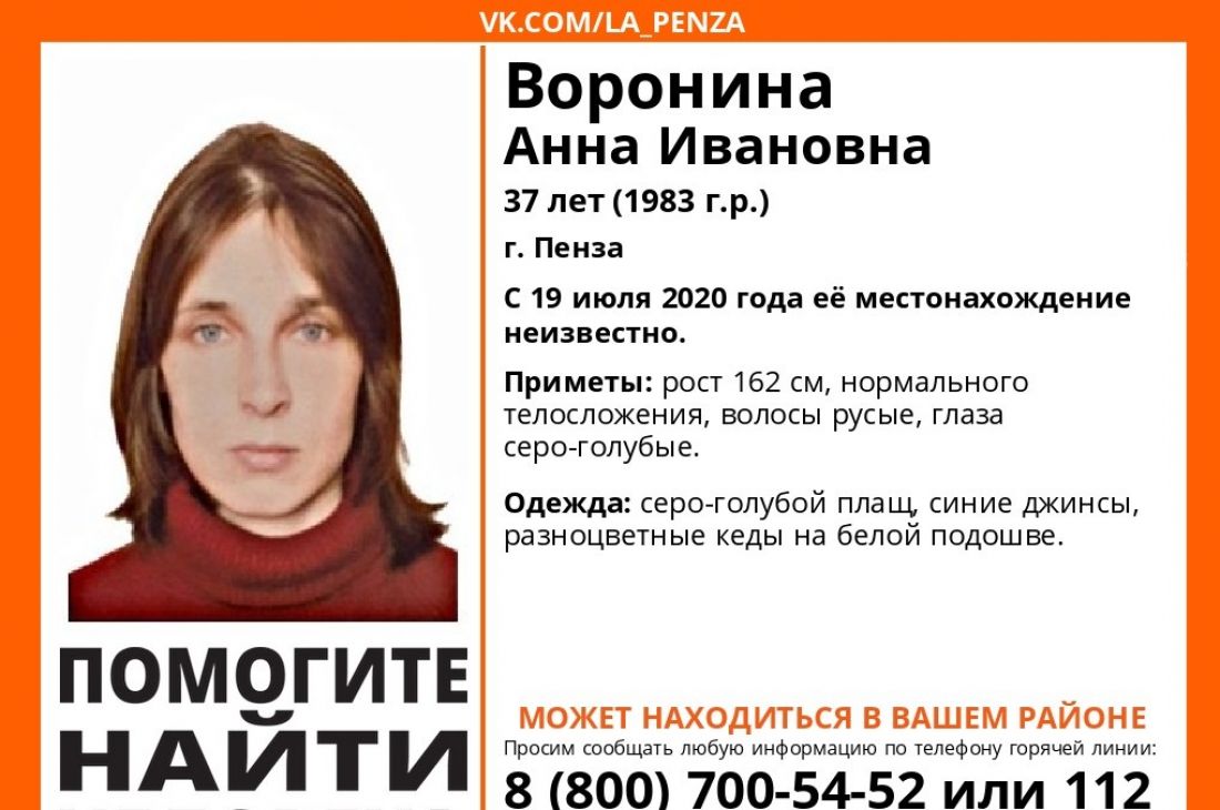 В Пензе пропала 37-летняя Анна Воронина, информации о местонахождении которой нет с 19 июля. Сведения об исчезновении женщины появились в группе добровольческого поисково-спасательного отряда «Лиза Алерт Пенза» в социальной сети «ВКонтакте».