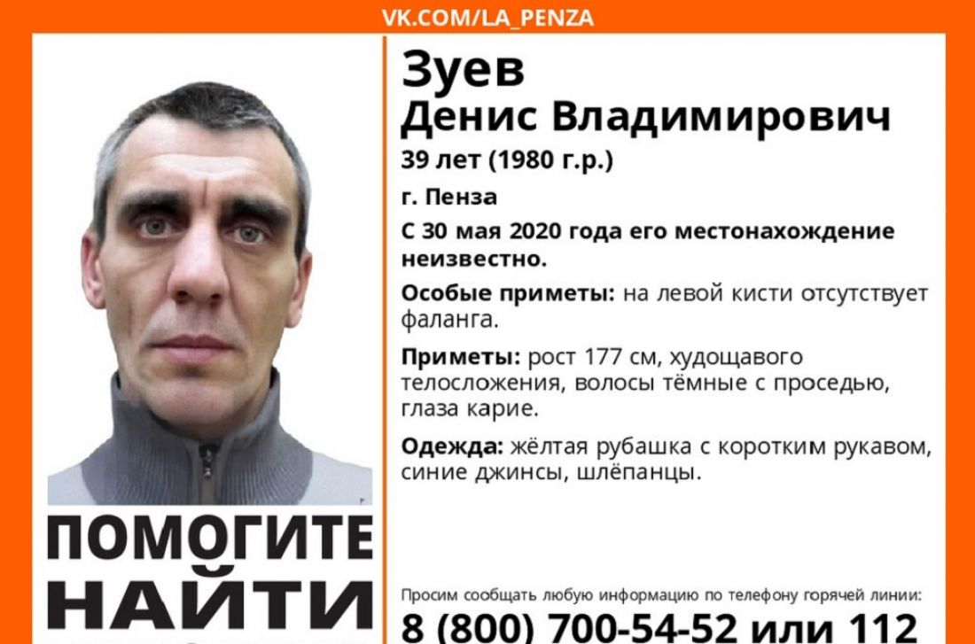 В Пензе ведутся поиски 39-летнего Дениса Зуева, о местонахождении которого нет информации с 30 мая. Его поисками занимаются добровольцы поисково-спасательного отряда «Лиза Алерт Пенза» и сотрудники полиции.