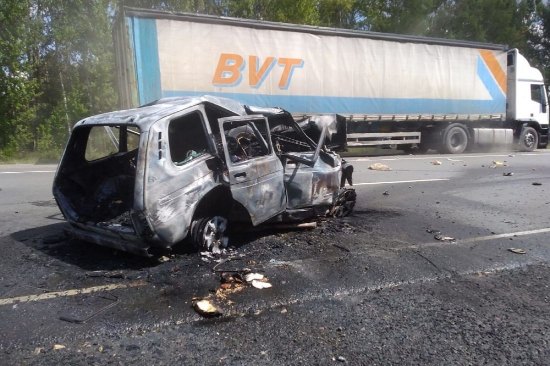 Как сообщила пресс-служба ГУ МЧС России по региону, в ликвидации последствий аварии участвовали пожарно-спасательные подразделения. Судя по фотографии, предоставленной ведомством, искореженный российский внедорожник полностью сгорел.