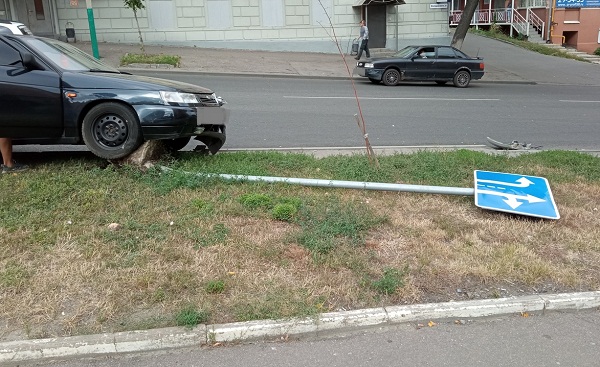Результатом столкновения стали повреждения передней части иномарки и левой стороны «десятки». Отечественная машина вылетела на обочину и сбила дорожный знак.