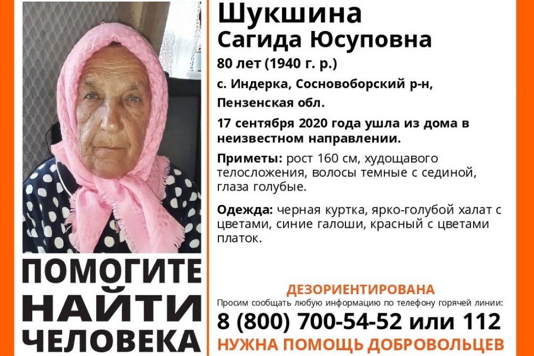 Пензенские добровольцы сообщили о поисках 80-летней женщины. Сагида Шукшина, проживающая в селе Индерка Сосновоборского района, пропала накануне, 17 сентября.