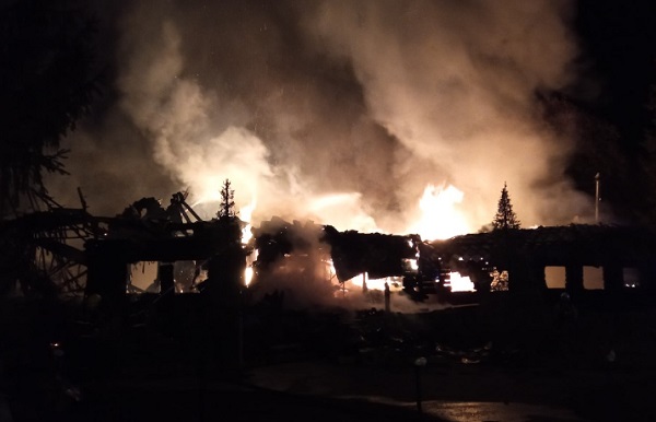 20:15 – продолжается открытое горение. На фото и видео удалось зафиксировать здание, полностью охваченное огнем.