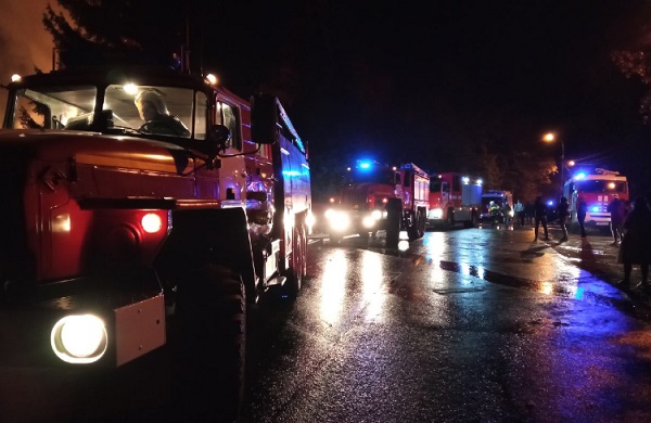 22:05 – открытого огня с улицы уже не видно. Пожарные проливают здание водой. Спустя несколько минут поступает информация от МЧС о том, что возгорание ликвидировано.