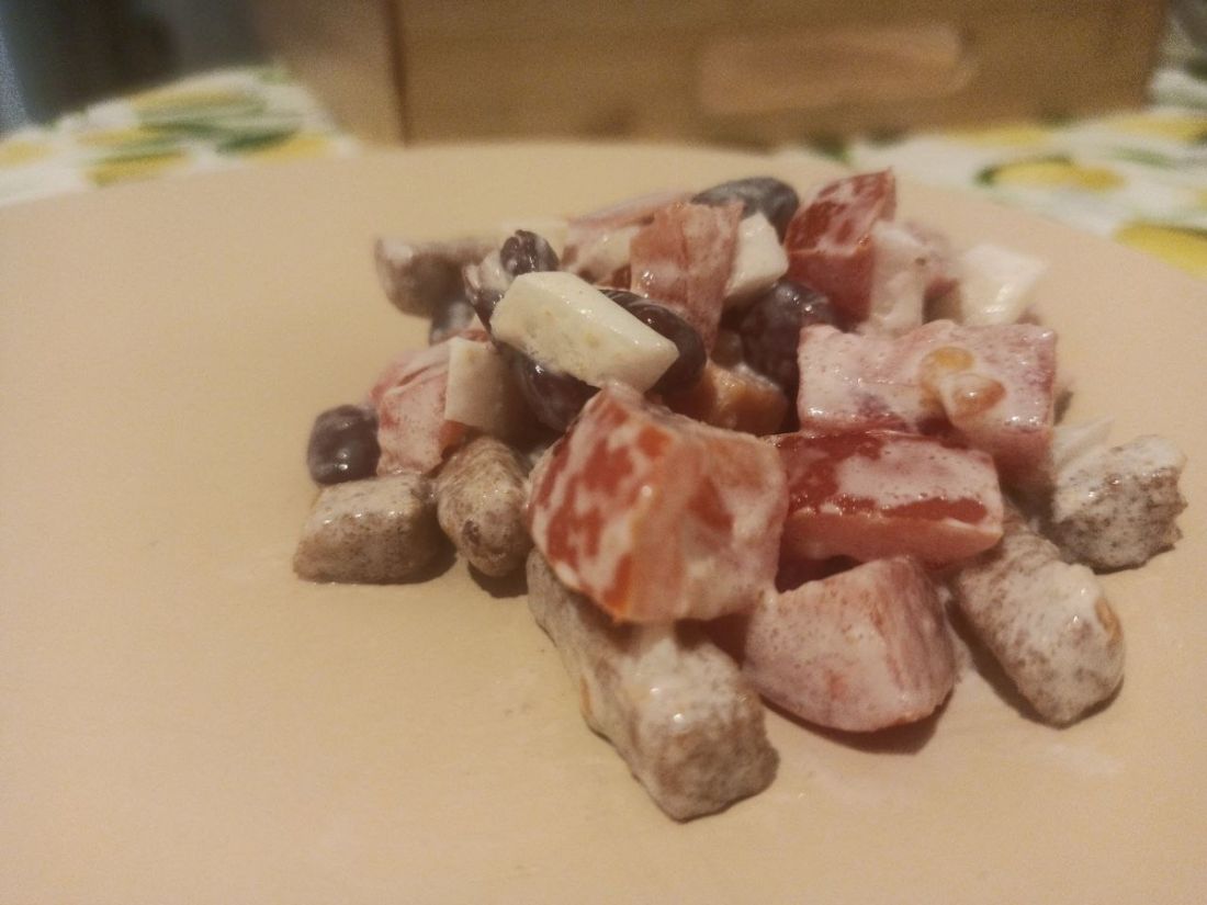 5) Промойте фасоль и добавьте к остальным ингредиентам. Можно слегка посолить, но помните, что сухарики и колбаса уже соленые.