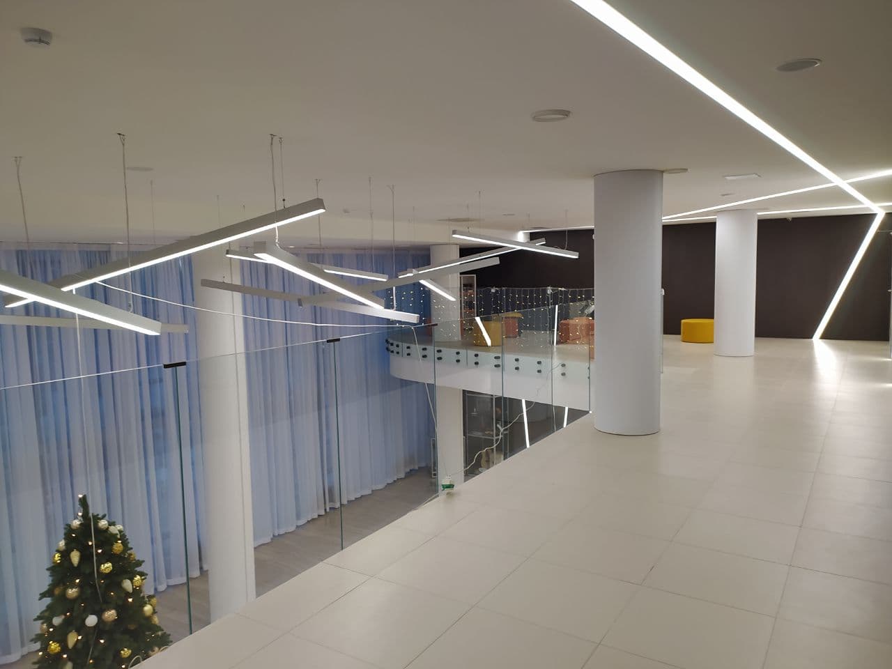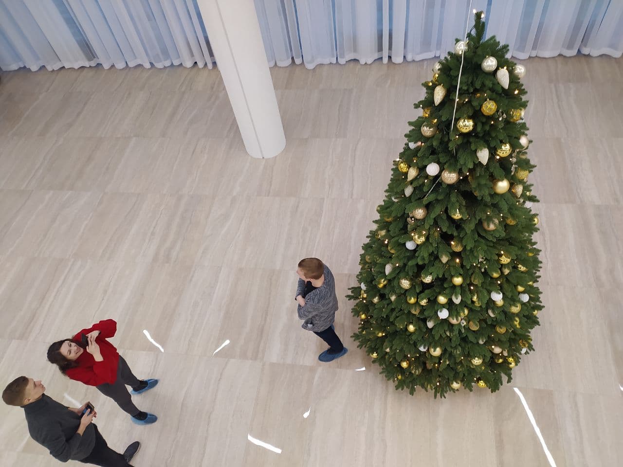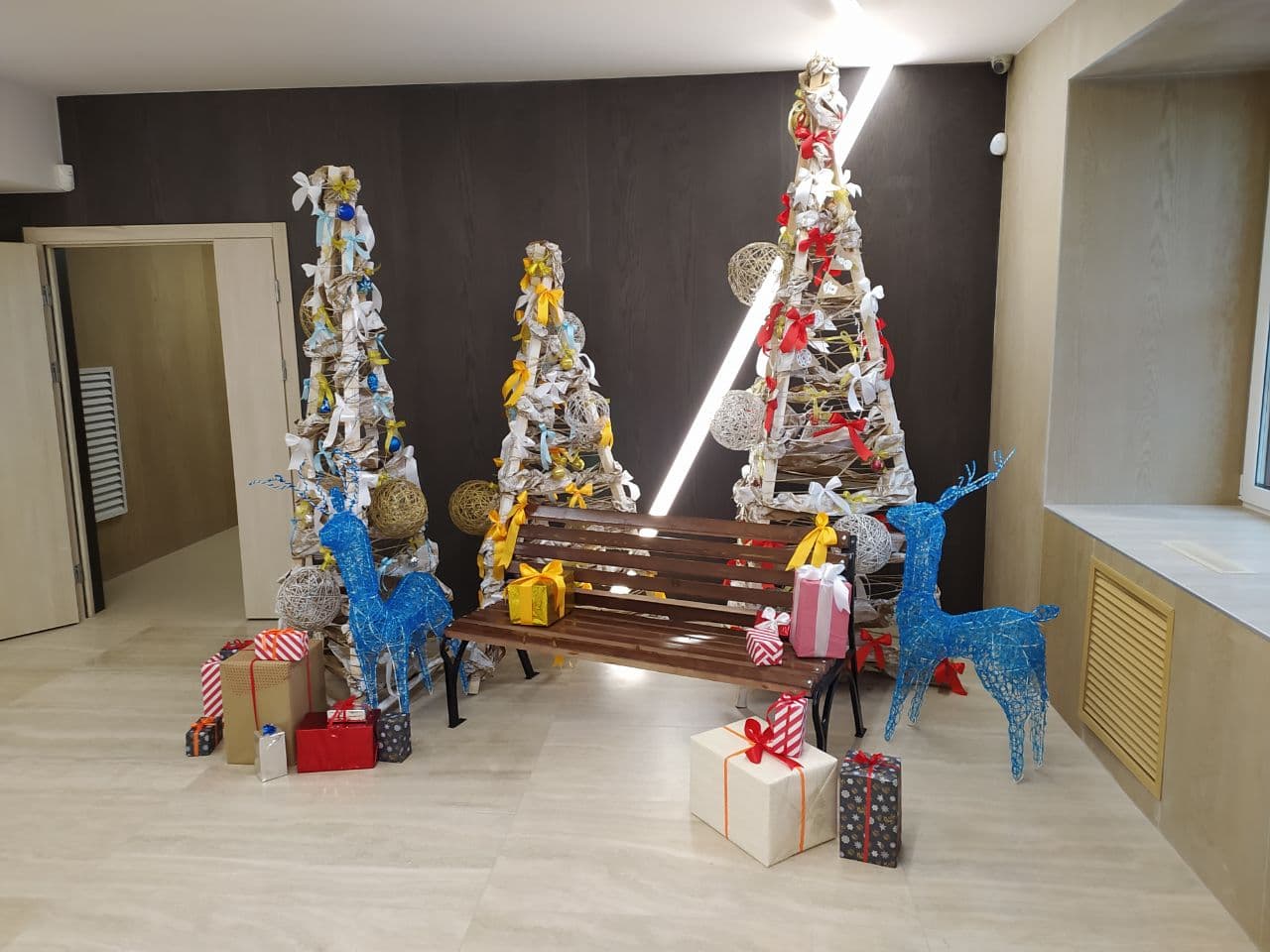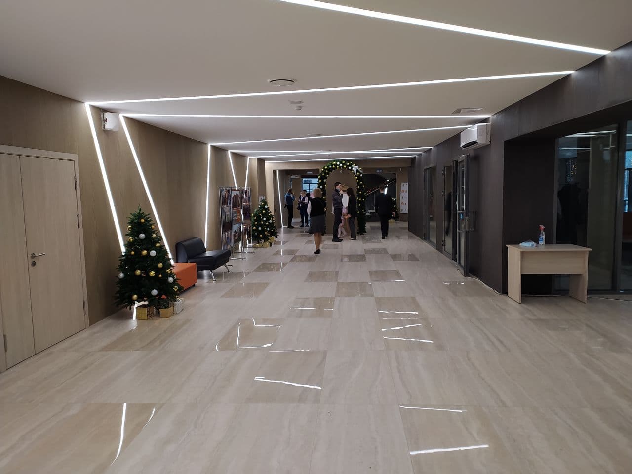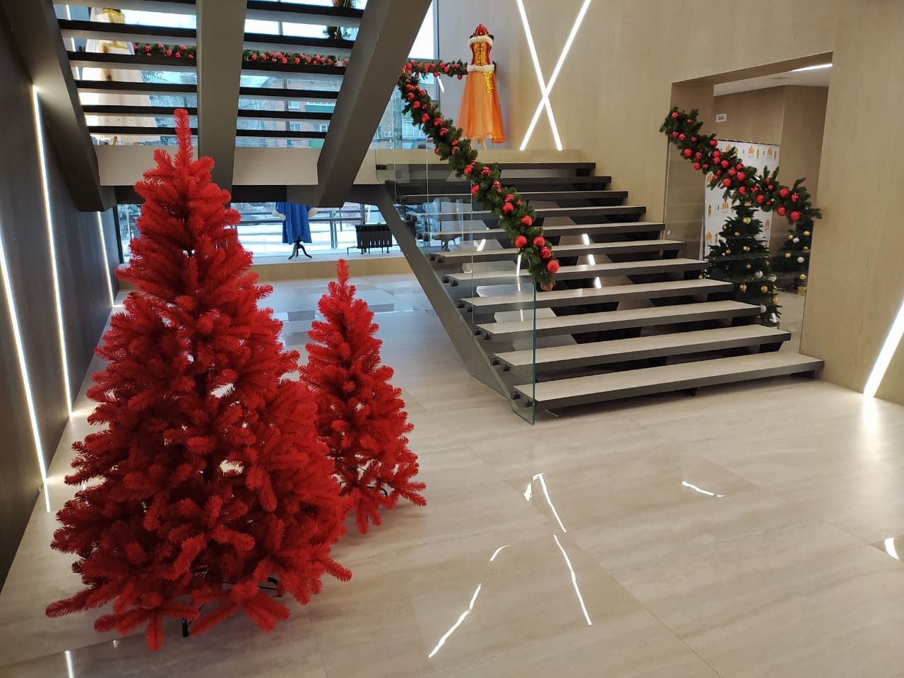 Идем внутрь. Здесь все еще круче — современный интерьер подчеркивают светильники в стиле high-tech, сделанные в форме прямых линий. Они то сходятся, то разбегаются на стенах здания. Новогоднее оформление с футуристическими красными елками напоминают о торжественности момента.