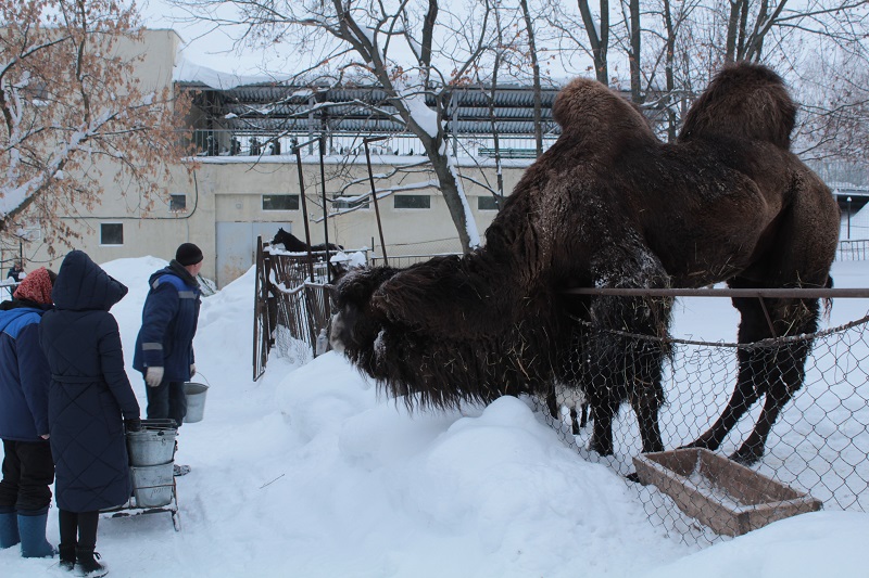 «Тут и свежие овощи - морковь, картошка, и комбикорм, плюс ветки даем, сено», - рассказывает кипер. Верблюд Аксарай грозно нависает над тропинкой в ожидании своей порции вкусняшек. Он вполне органично смотрится среди белоснежных огромных сугробов.