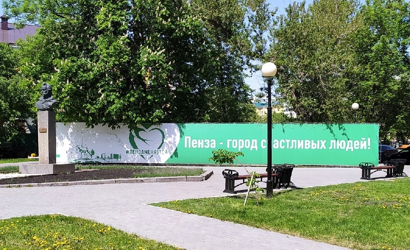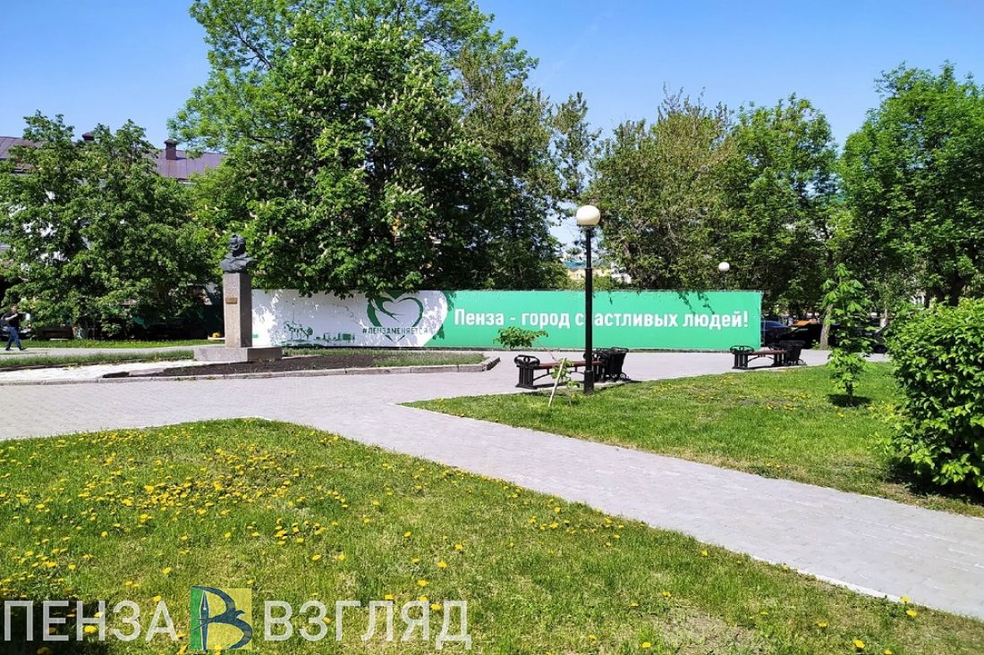 В сквере Дениса Давыдова - огромный баннер, заявляющий, что Пенза - город счастливых людей.