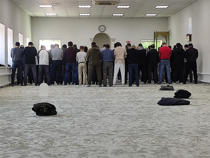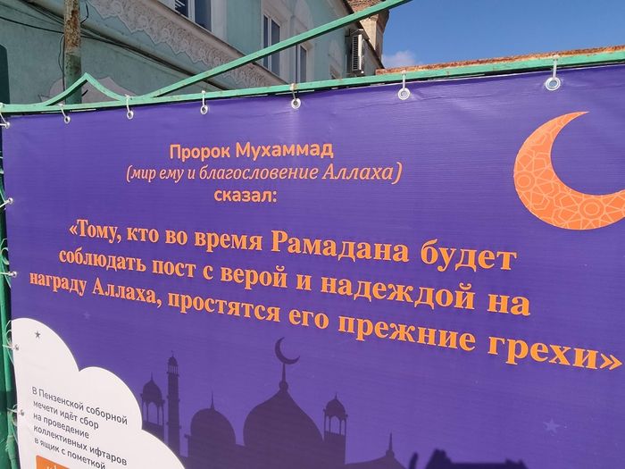 В полдень, самый разгар рабочего дня, рядом с мечетью о Рамадане напоминает только вывеска на ограждении с цитатой пророка Мухаммада и объявлением о сборе средств на проведение коллективных ифтаров — ежедневных разговений, куда мусульмане приглашают родственников, друзей и представителей общины.