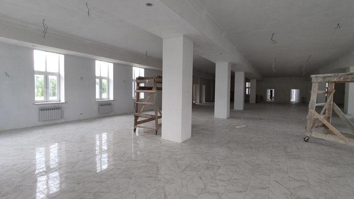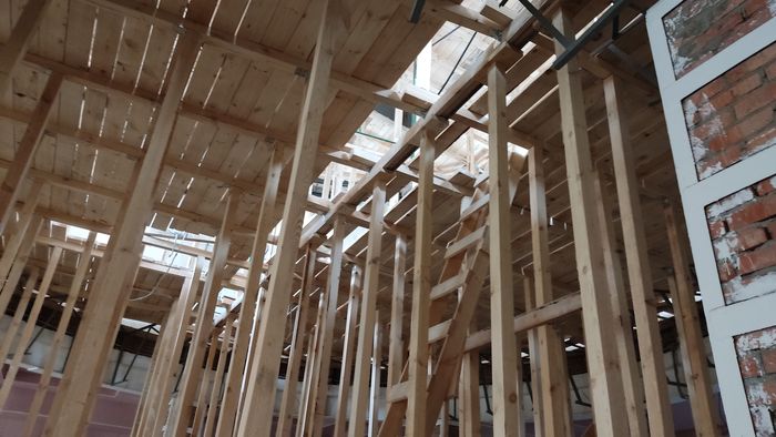 На входе и в будущих молельных залах лежат материалы, а в самом центре возвышаются строительные леса.