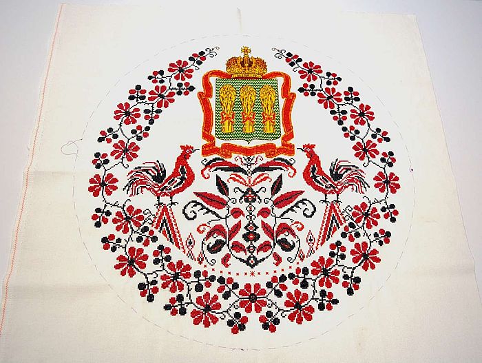 Одной из вышивальщиц, которые создавали «русский» фрагмент карты, была Наталья Карабина. В круглом поле два петуха поддерживают геральдическую группу, включающую герб Пензенской области и корону. «Петухи символизируют достаток, это исконно русский символ. Вокруг цветочный орнамент в красно-черных тонах - мы видим шиповник, который часто изображался на русских платках и полотенцах», - объясняют представители клуба «Пенза Stitch».
